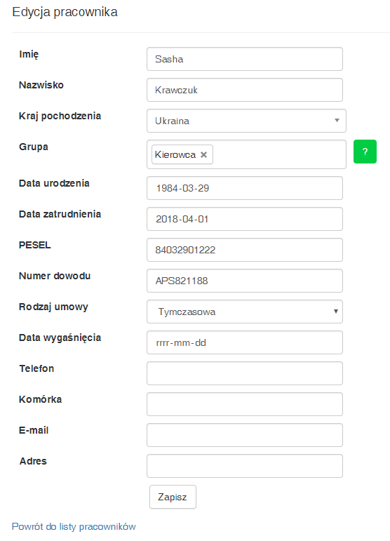 User can create as many employees of his work space as he wants. He can fill in all employee-specific information like name, birthday, nationality, employment date, type of contract, tax number and employee's contact details. Thanks to that he'll have easy access to all the information when needed. The user can also create employee groups to bind employees e.g. of similar role within the company. All created employees are accessable everywhere within the application, so for example the user can later assign an employee as a driver to transport order.