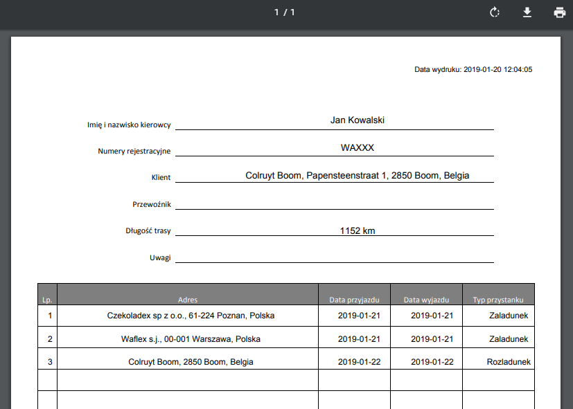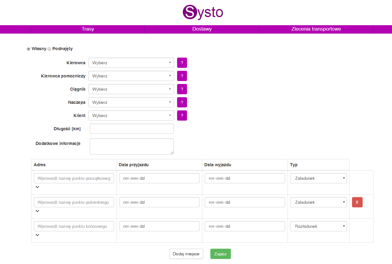 The core functionality of the application in its current state is management of transport orders. The user can add transport order, both executed with company's own fleet or by subcontractor. Every order has to have start point and end point, but it's possible to create countless number of intermediate points. The user can choose a driver and a truck from company's own resources, or forwared in case of subcontracted orders.